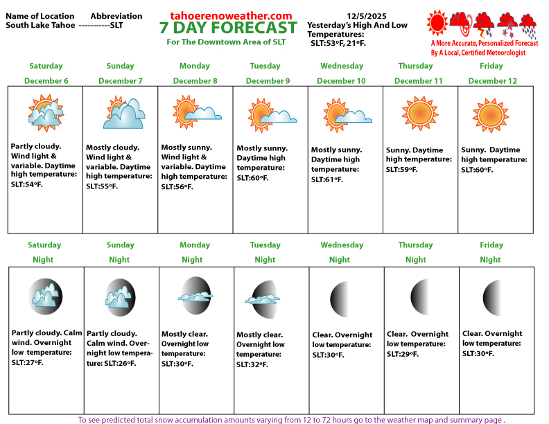 This is the summary and description of the above south tahoe 7 day forecast picture. Which includes a description of each day and night’s weather with day of the week headings and the date. It also gives a weather symbol representing each day and night, for the south tahoe 7 day weather forecast. Each day and night interval gives the hi and low temperatures for the day and description and picture of the sky coverage. This consists of fair or sunny skies, mostly sunny or mostly fair skies and partly cloudy, mostly cloudy and cloudy skies. And it also give the probability of precipitation and type of precipitation. In addition it also gives the wind speed and direction for the first two and half days of the seven day forecast. And it also gives the observed daytime high temperature and overnight low temperature for South Lake Tahoe.