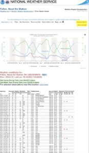 The Fallon Weather Station is a link to the National Weather Service, Naval Air Station in Fallon. It shows the temperature, relative humidity, wind speed, wind direction, barometric pressure, dew point, wind chill, sky condition and weather for Fallon, NV. Maximum and minimums can also be determined for the previous weather variables. This data is given for the past 3 days, however, the past 7 days can be selected at the top of the page.