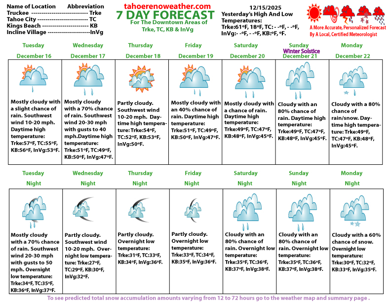 This is the summary and description of the above North Lake Tahoe weather forecast picture. Which includes a description of each day and night’s weather with day of the week headings and the date. It also gives a weather symbol representing each day and night, for the next seven days of the weather forecast. Each day and night interval gives the high and low temperatures for the day and description and picture of the sky coverage. This consists of fair or sunny skies, mostly sunny or mostly fair skies and partly cloudy, mostly cloudy and cloudy skies. And it also give the probability of precipitation and type of precipitation. In addition it also gives the wind speed and direction for the first two and half days of the seven day forecast. And it also gives the observed daytime high temperature and overnight low temperature for Truckee, Tahoe city and Incline village.