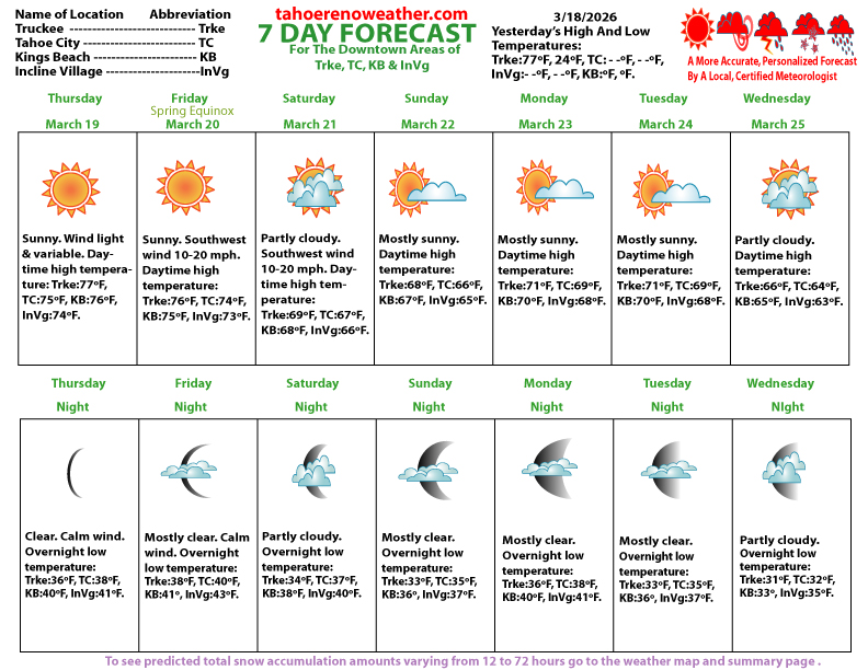 This page also has the logo and mission statement and website address for the the Tahoe-Reno-Carson Weather. And furthermore it has links to other seven day forecast on the website and a link to a great satellite picture.