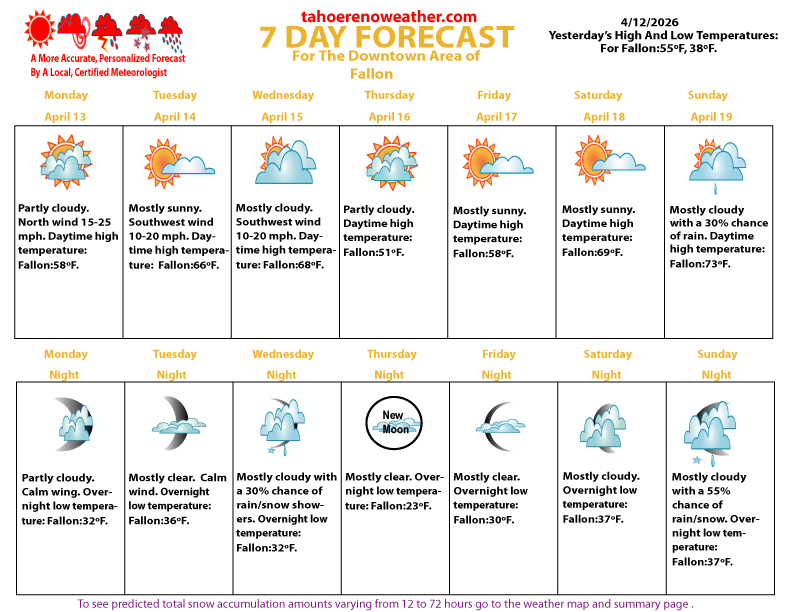 This is the summary and description of the above seven day forecast picture for Fallon. Which includes a description of each day and night’s weather with day of the week headings and the date. It also gives a weather symbol representing each day and night, for the next seven days of the weather forecast. Each day and night interval gives the high and low temperatures for the day and description and picture of the sky coverage. This consists of fair or sunny skies, mostly sunny or mostly fair skies and partly cloudy, mostly cloudy and cloudy skies. And it also give the probability of precipitation and type of precipitation. In addition it also gives the wind speed and direction for the first two and half days of the seven day forecast. And it also gives the observed daytime high temperature and overnight low temperature for Fallon.