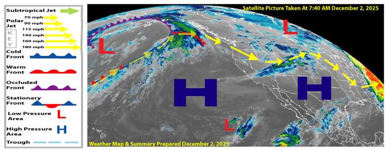 The satellite and weather map is prepared for the following downtown areas: Kings Beach, Tahoe City, Truckee, incline Village, South Lake Tahoe, Reno, Carson, City, Minden, Dayton, Fernley, Fallon, Silver, Springs, an Yerington. The date and time that the satellite picture was taken are indicated in green writing on the map. The summary portion of this page which is below, will be discussed in the context of a seven day forecast period.